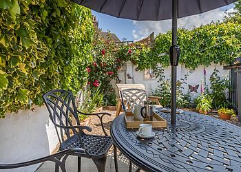 The enclosed patio garden catches sun throughout the day and comes with luxury outdoor furniture.
